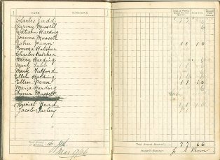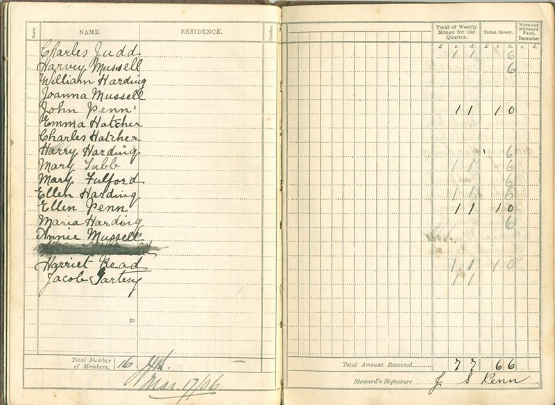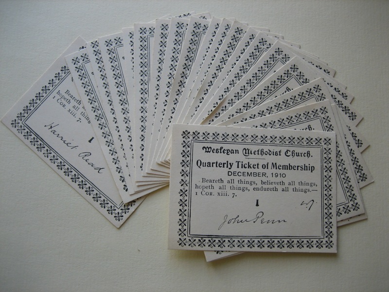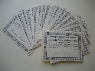 I was given a copy of a Methodist Class Book......... This was found by a gentleman browsing a boot sale in Wokingham some ten years ago. It caught his eye and on instinct, being from a Methodist family himself, he decided to buy it. The pages list members of a bible class and is dated from March 1906 to December 1910. It doesn't say on it where the book originated from, but with the publication of the 1901 census and using the names in the book, the gentleman decided to try and locate its home. He discovered many of people named in the book living in West Grimstead at that time. Click on pages above to enlarge On doing a 'Google' search for West Grimstead he came across this website and got in touch with me and offered to send the book to me if I would like it. When the book arrived I found in it many family names. How did this little book get to be in a book sale in Wokingham? We probably will never know. The book was kept up todate by John Penn, my husband's great uncle, and in the back of the book was a little envelope containing all the membership cards. |