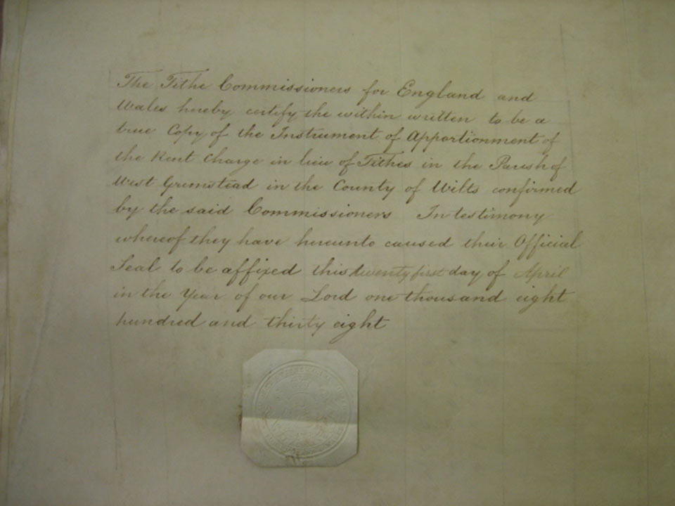 "The Tithe Commisssioners for England and Wales hereby certify the within written to be a true copy of the Instrument of Apportionment of the rent charge in lieu of Tithes in the Parish of West Grimstead in the County of Wilts confirmed by the said Commissioners In testimony whereof they have hereunto caused their official Seal to be affixed this twenty first day of April in the year of our Lord one thousand eight hundred and thirty eight"